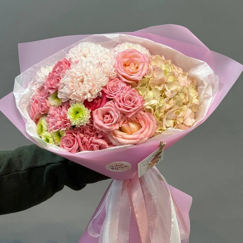 Nezhnij buket s gortenziej, rozami, diantusami i hrizantemami
