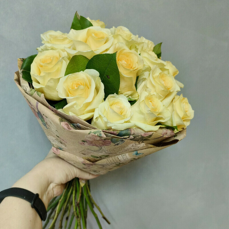 Nezhnij zhelto-kremovij tcvet roz i priyatnij aromat