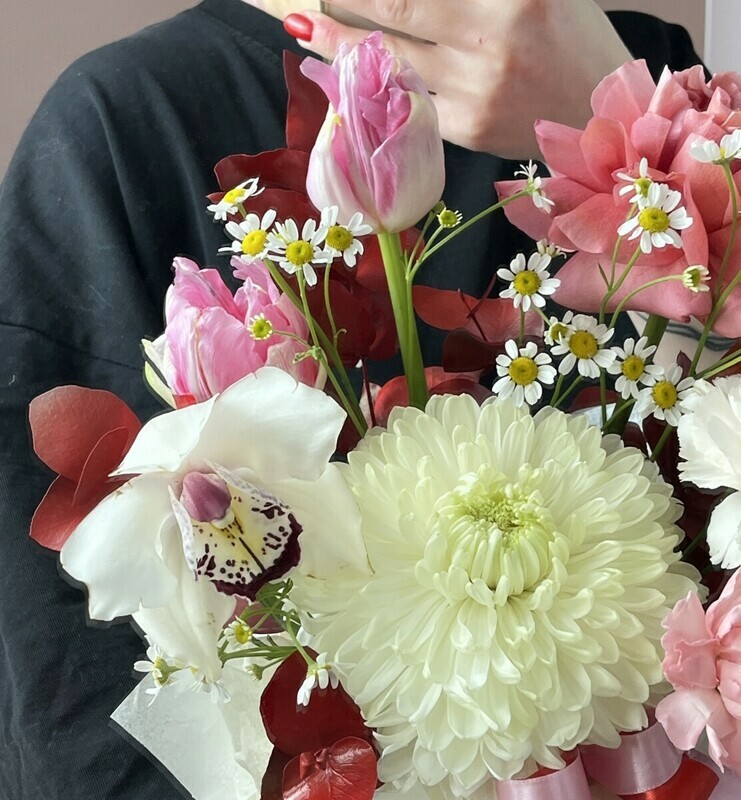 - YArkaya kompozitciya s matrikariej, orhideya, roza, hrizantema, tyul_pani