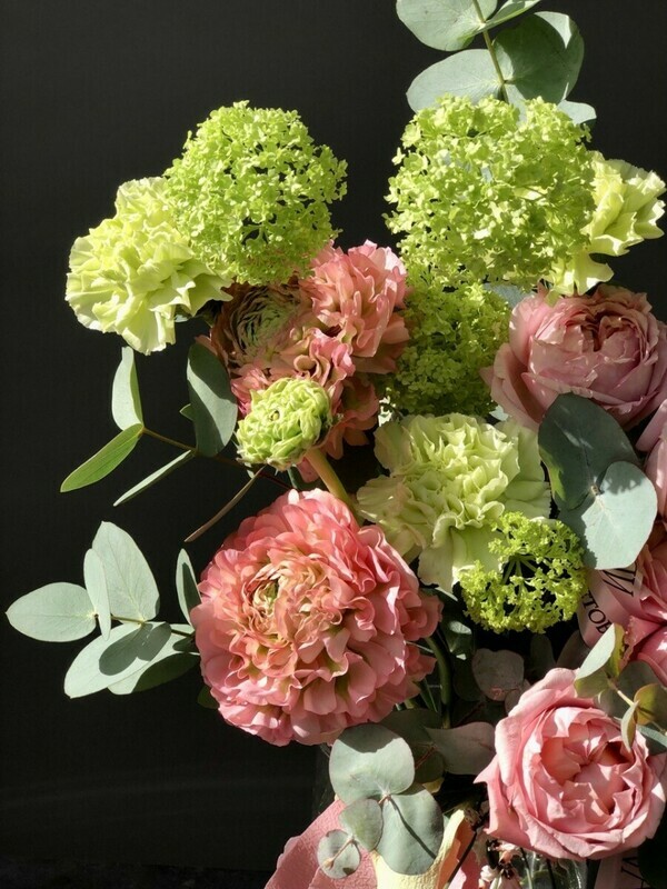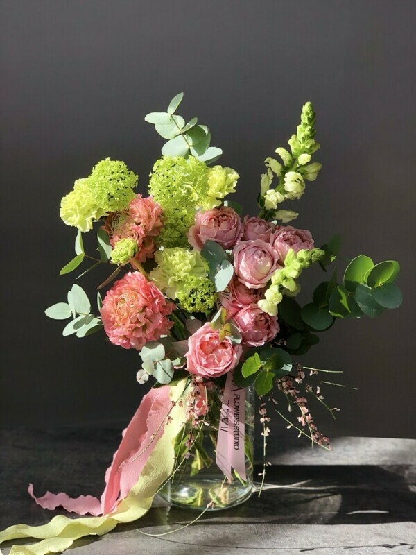 - Buket s rozovimi ranunkulyusami i vesennimi vetochkami TVOYA VESNA