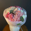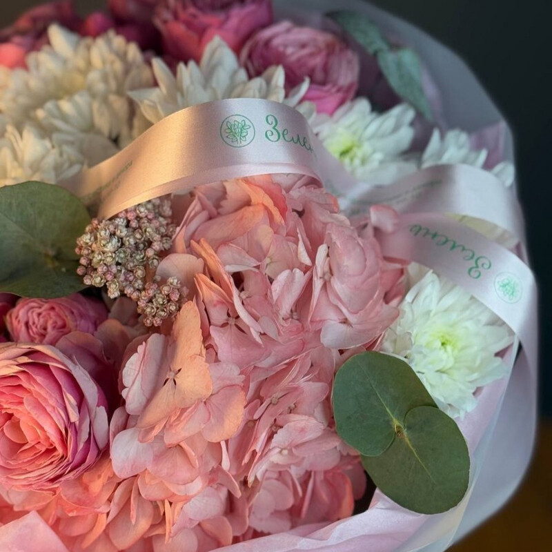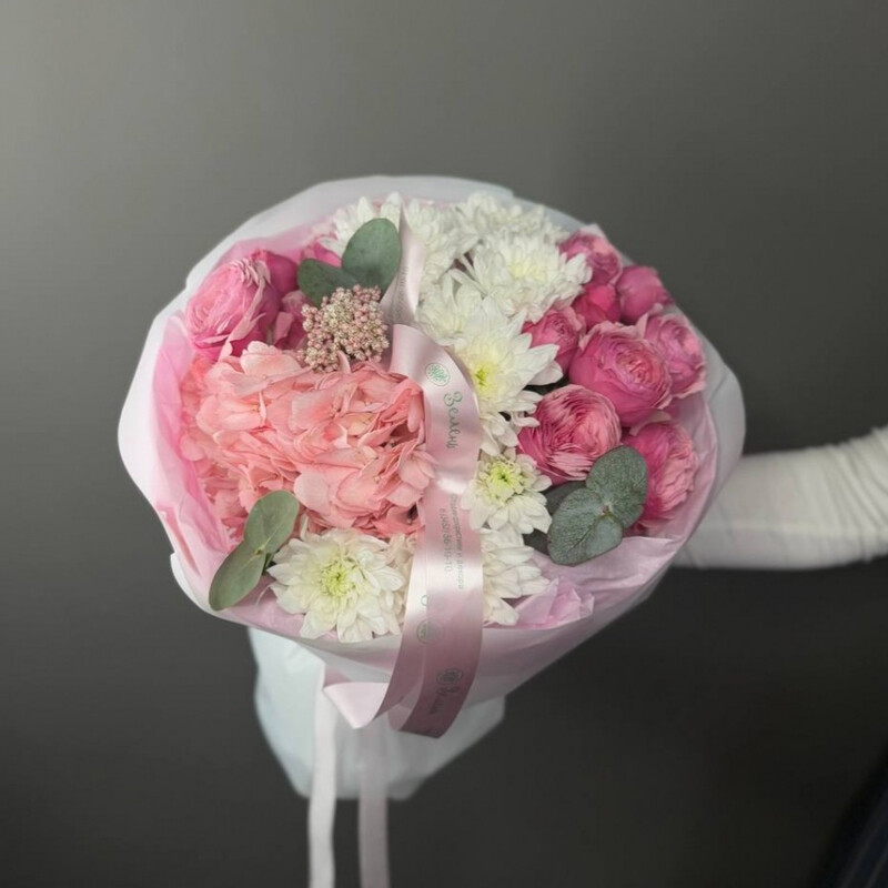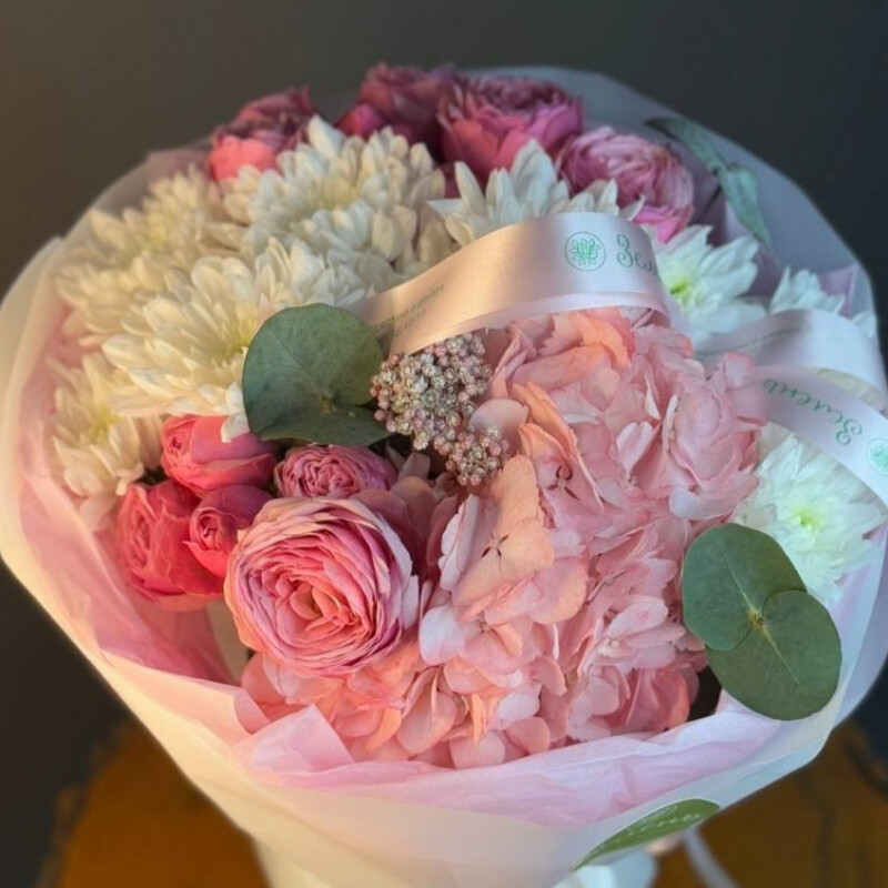 - Buket v rozovih ottenkah s gortenziej i hrizantemami