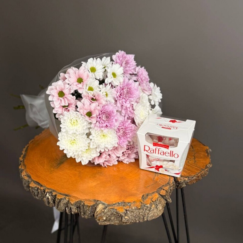 Nabor buket iz 9 kustovih hrizantem miks + korobka rafaello