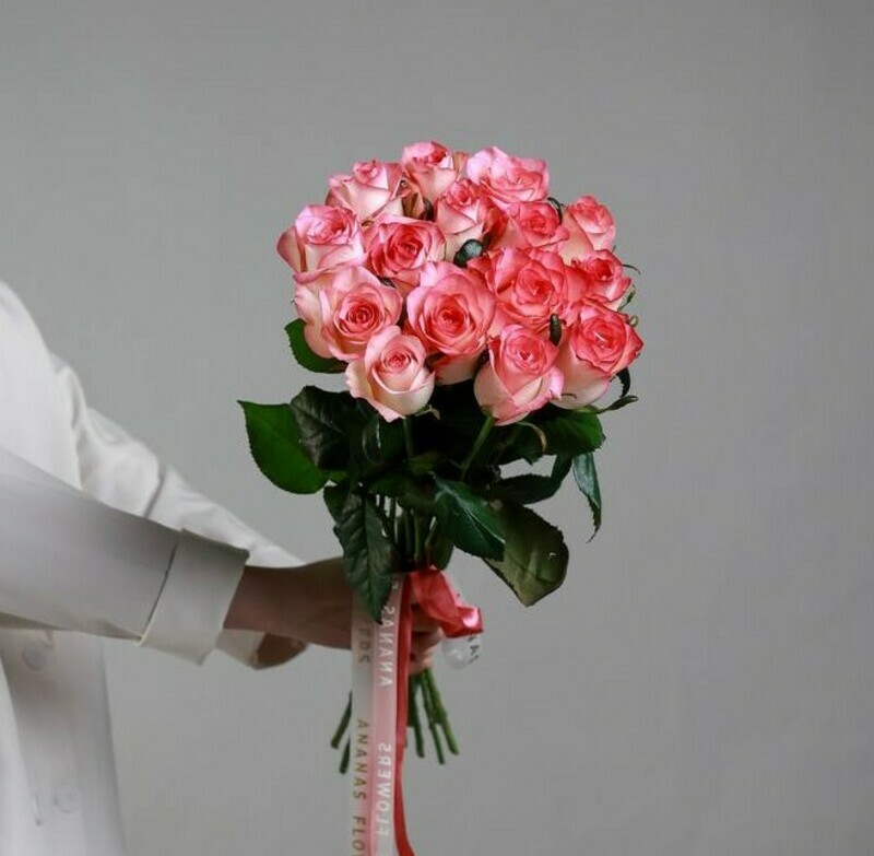 - Monobuket iz 15 rossijskih rozovih roz pod lentu