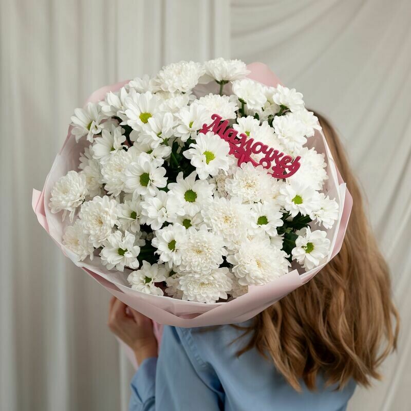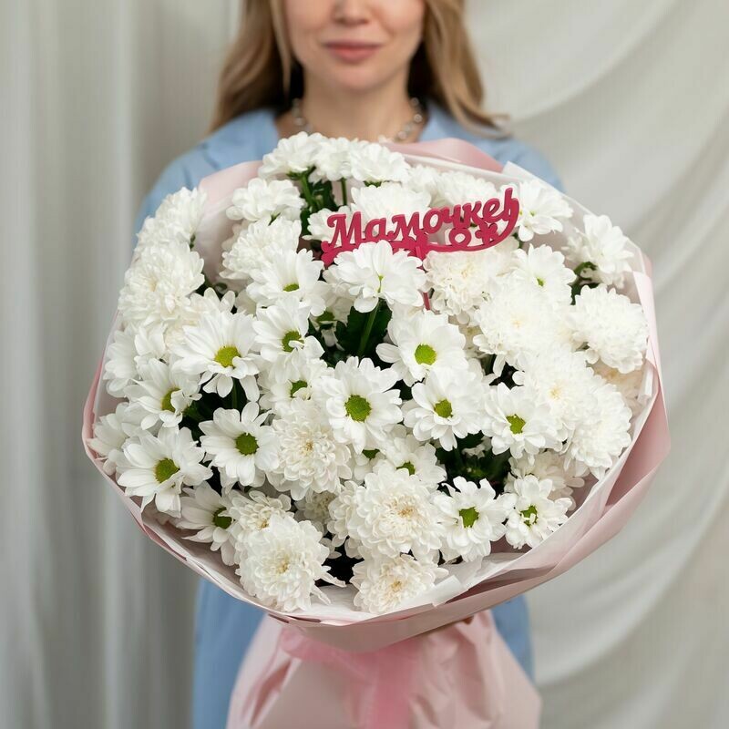 Buket iz hrizantem miks s topperom «Mamochke»: nezhnost_ v kazhdom tcvetke