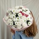 Hrizantemi miks belogo tcveta — osnova kompozitcii. Nezhnie lepestki i yarkie zelyonie serdtcevini sozdayut oshushenie svezhesti i chistoti. Belie hrizantemi simvoliziruyut iskrennost_, chistotu pomislov i glubokuyu privyazannost_.