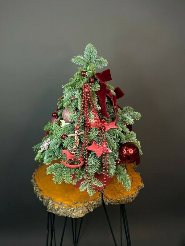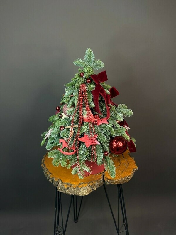 Novogodnyaya kompozitciya "Elochka iz nobilisa" s busami i bantikami krasnaya 50sm