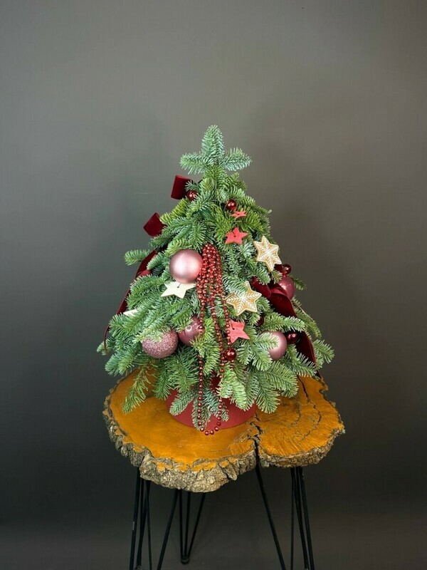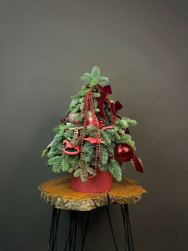 - Novogodnyaya kompozitciya "Elochka iz nobilisa" s busami i bantikami krasnaya 50sm
