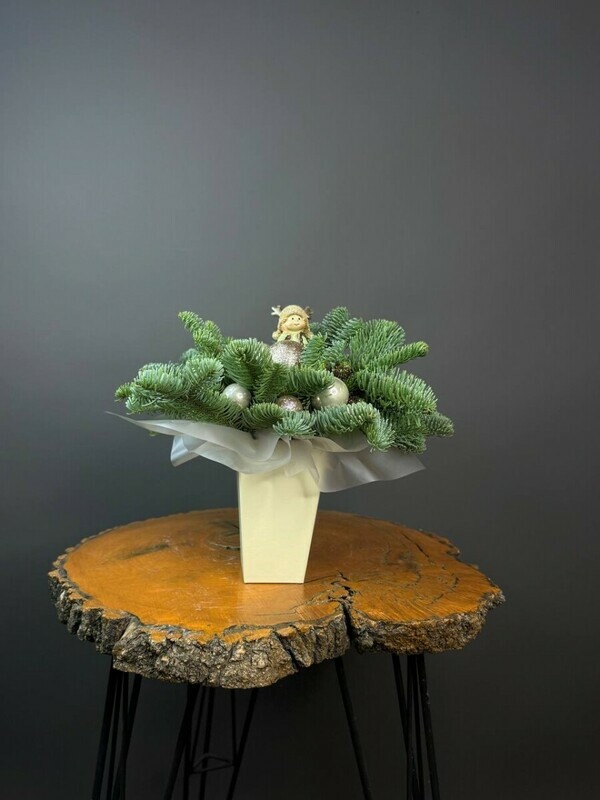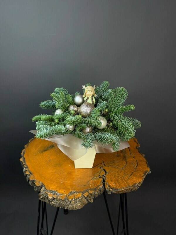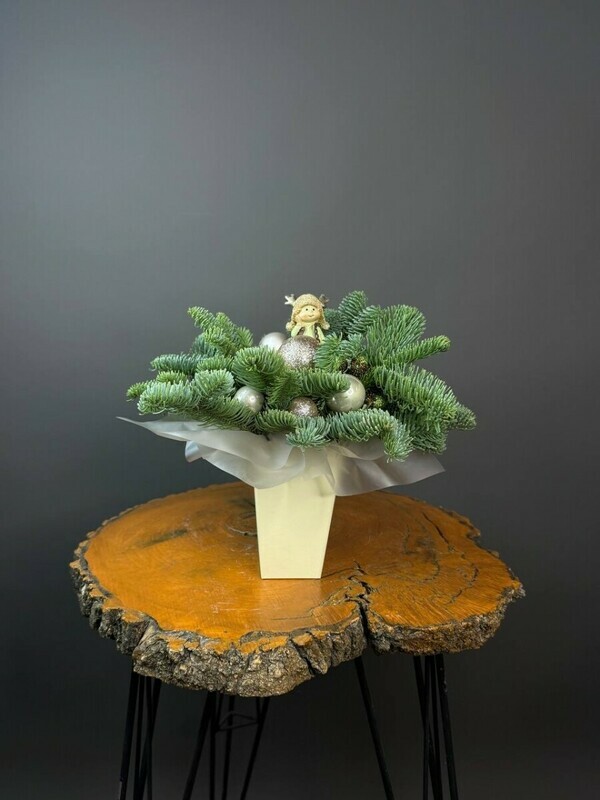 - Novogodnyaya kompozitciya v korobochke iz nobilisa s igrushkami, zoloto