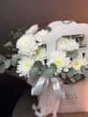 - TCvetochnaya kompozitciya v sumochke, razmer M, s belimi hrizantemami i evkaliptam