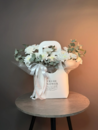 TCvetochnaya kompozitciya v sumochke, razmer M, s belimi hrizantemami i evkaliptam
