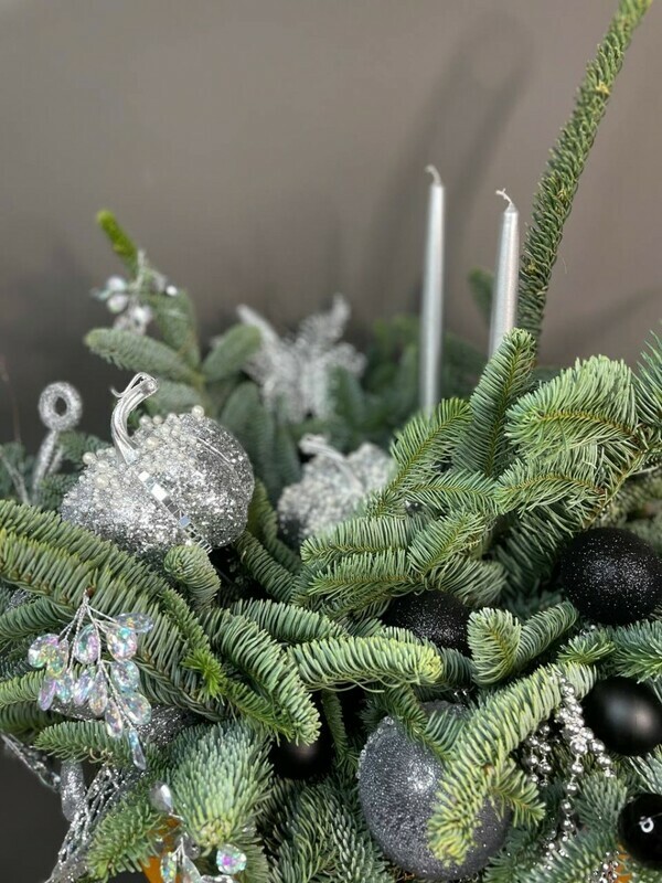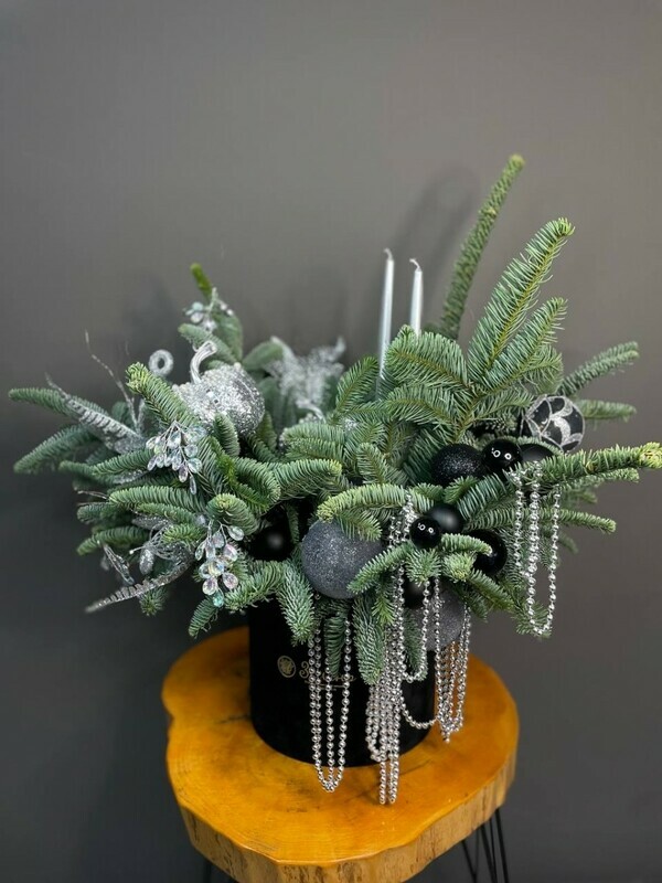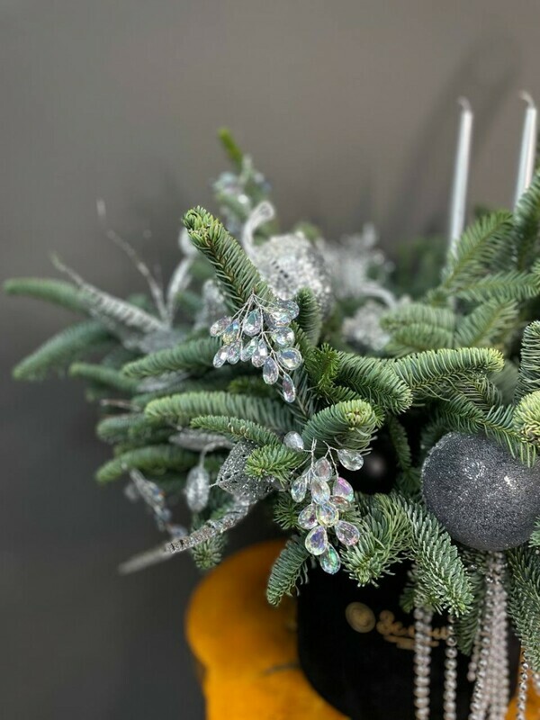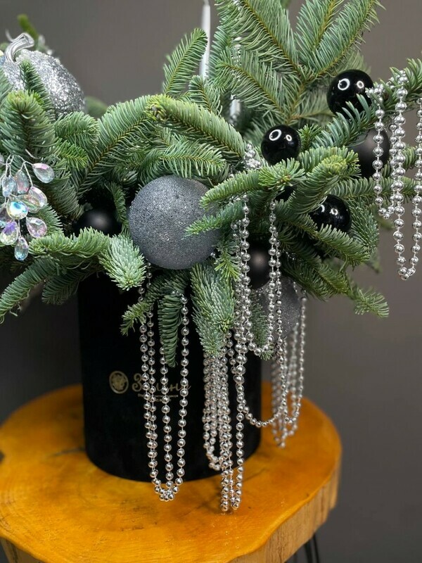 - Novogodnyaya kompozitciya iz nobilisa v chernoj barhatnoj korobke s igrushkami