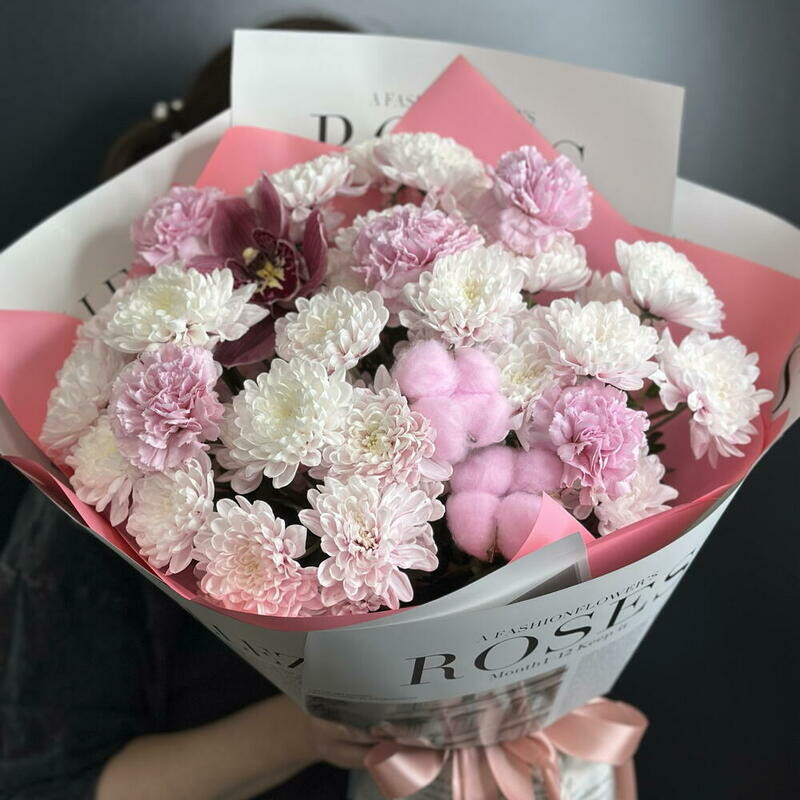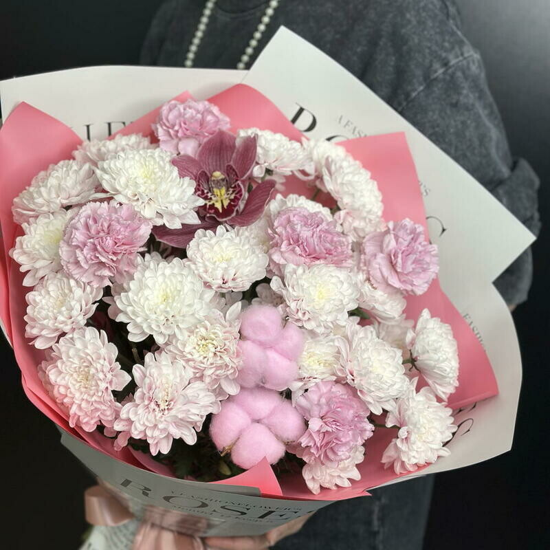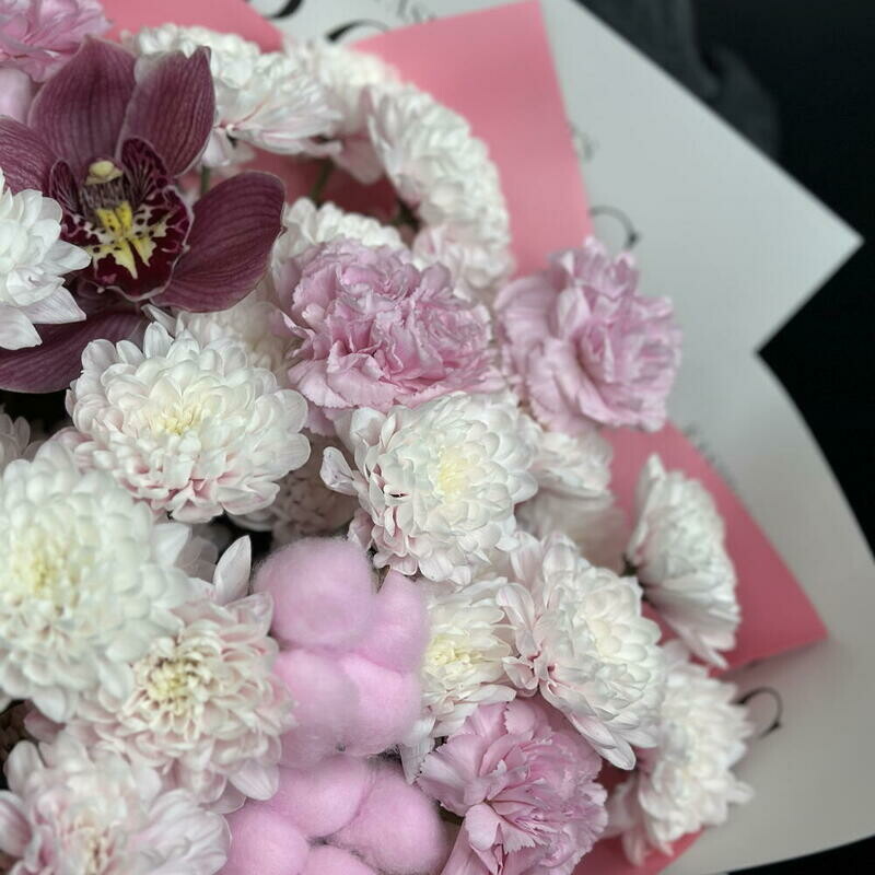 Inogda samoe volshebnoe rozhdaetsya iz prostogo. Znakomie vsem hrizantemi i gvozdiki, vstretivshis_ s pushistim hlopkom i blagorodnoj orhideej, prevrashayutsya v nechto sovershenno novoe. Etot buket dokazivaet, chto magiya — v sochetanii. On udivlyaet, zastavlyaet vzglyanut_ na obichnie veshi pod drugim uglom i darit to samoe chuvstvo — "kak prosto i kak genial_no!"