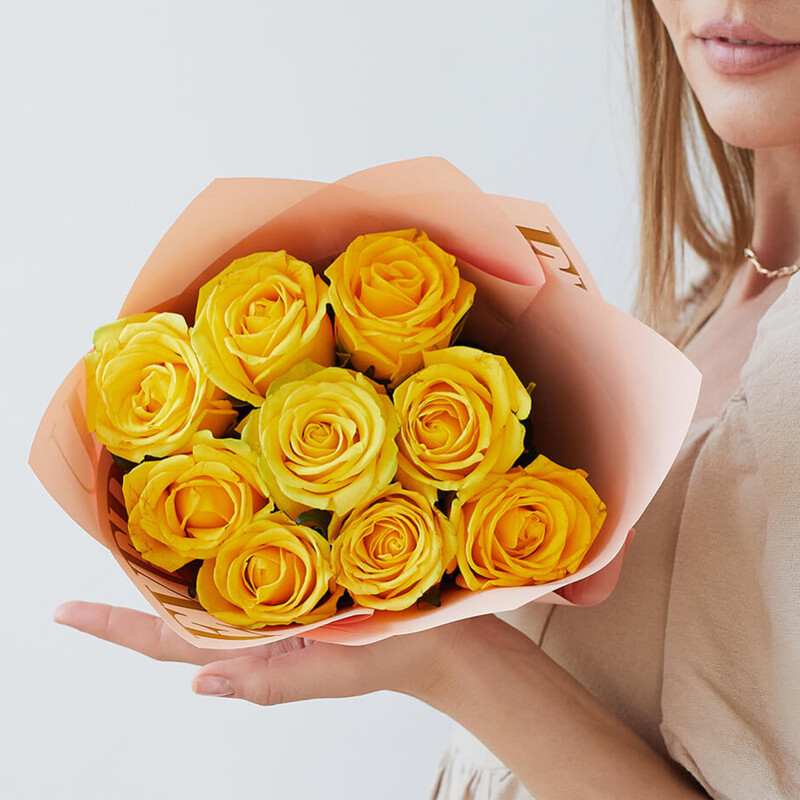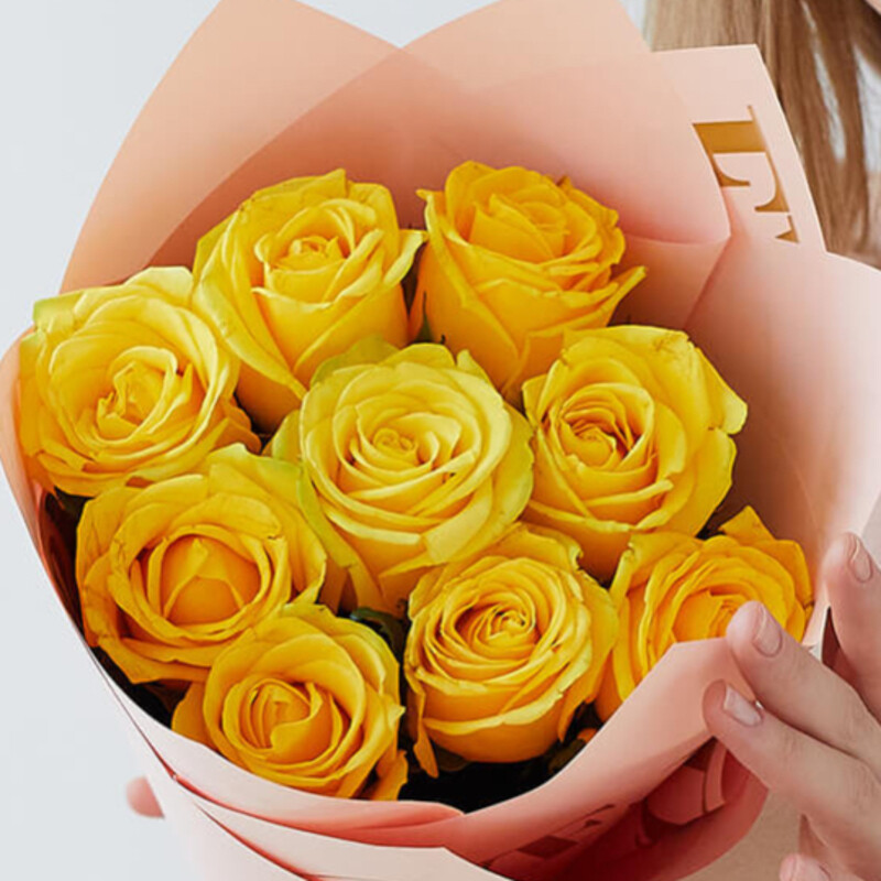 Buket iz 9 zhyoltih roz — iziskannaya kompozitciya, sozdannaya dlya yarkih emotcij. Roskoshnie rozi v zhyoltih ottenkah, sobrannie v elegantnuyu kompozitciyu, ukrashennuyu atlasnoj lentoj, stanut prekrasnim podarkom. Podojdyot dlya lyubih sluchaev i poraduet kazhdogo.