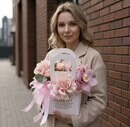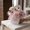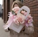 Nezhnaya kompozitciya v sumochke s orhideej, frantcuzskoj rozoj i kustovoj rozoj, standart