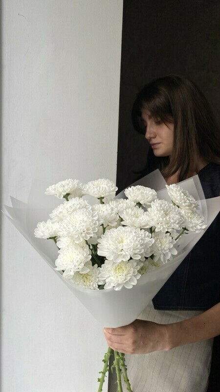 Buket iz 5 belih kustovih hrizantem «Altaj» — eto voploshenie elegantnoj klassiki, simvoliziruyushee chistotu, iskrennost_, uvazhenie i nezhnost_