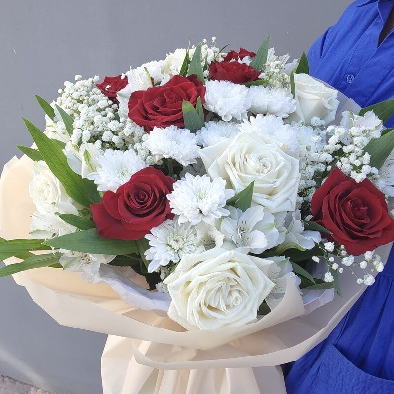 SHikarnij buket s rozami, hrizantemoj i al_stromeriej
