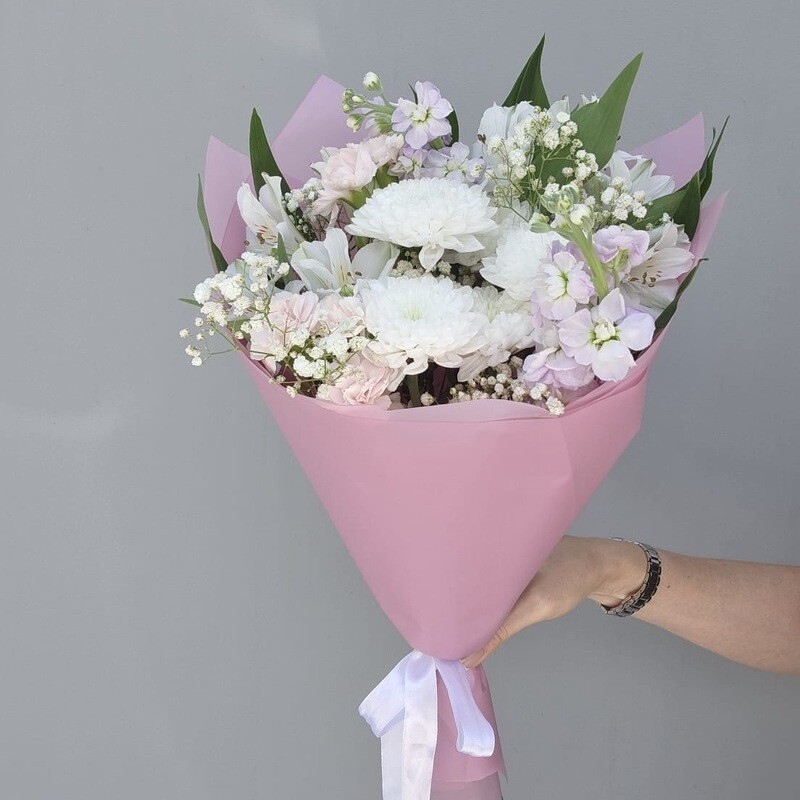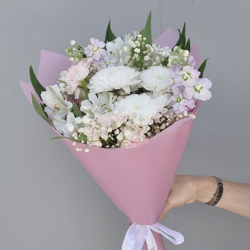 Milij buket kompliment s hrizantemoj, al_stromeriej i mattiolrj