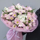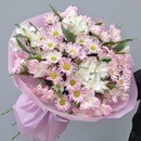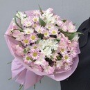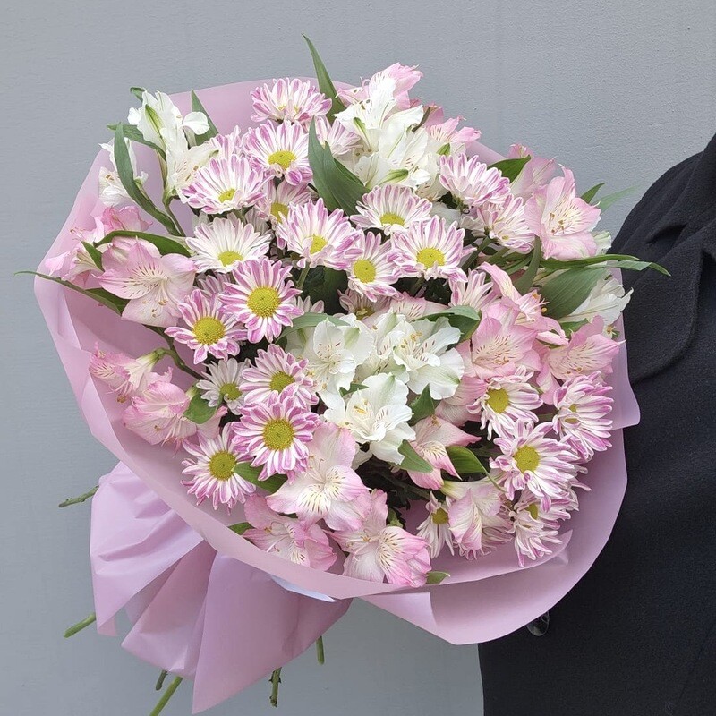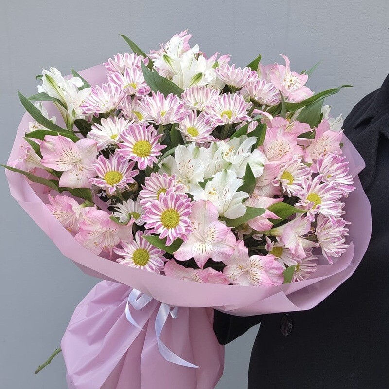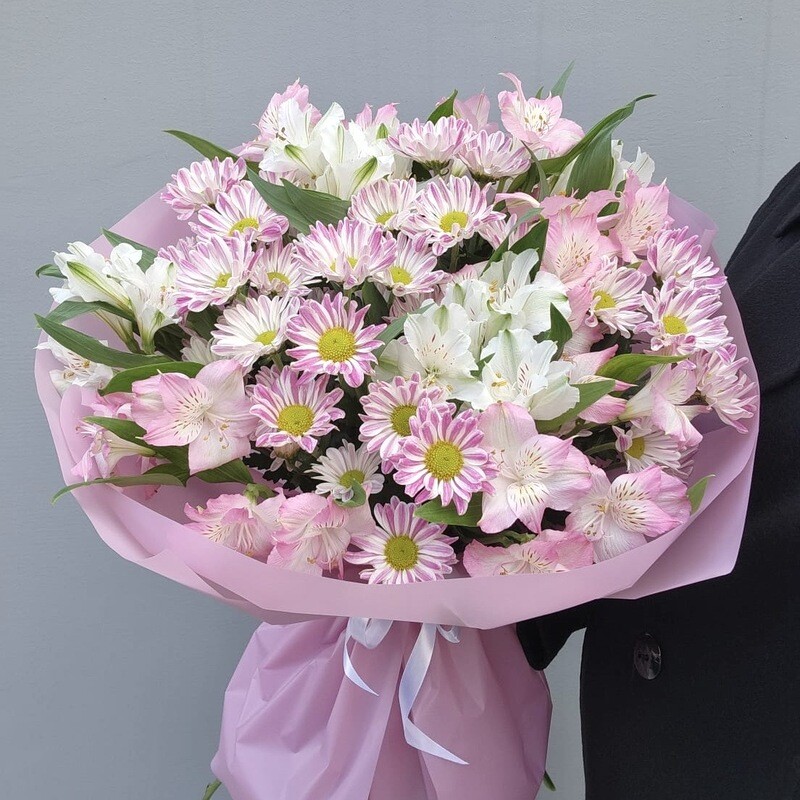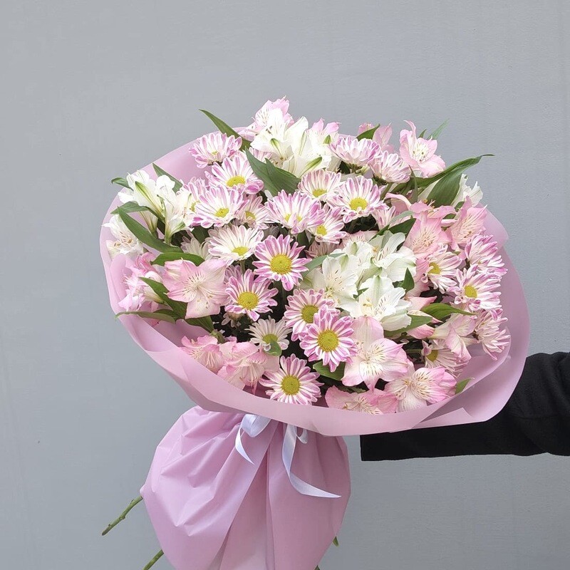 - Nezhnij kruglij buket s al_stromeriyami i kustovimi hrizantemami