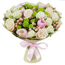 Akkuratnij buket v tonah utrennej svezhesti sobran iz rozovih tyul_panov, kremovih roz, belih kustovih rozochek, zelyonih hrizantem santini, rozovih yagod giperikuma i zeleni salala. Darite voploshenie nezhnosti.
