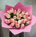 Buket sostoit iz 25 roz sorta Keniya Dzhumeliya, visota kotorih sostavlyaet 50 sm. Etot sort roz otlichaetsya svoej krasotoj i nezhnost_yu, a takzhe dolgim srokom svezhesti.