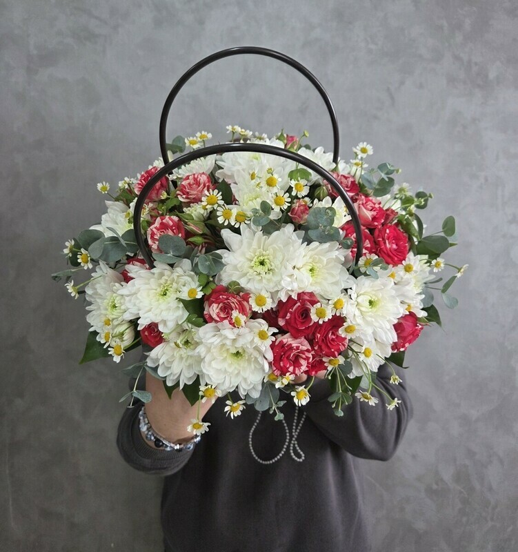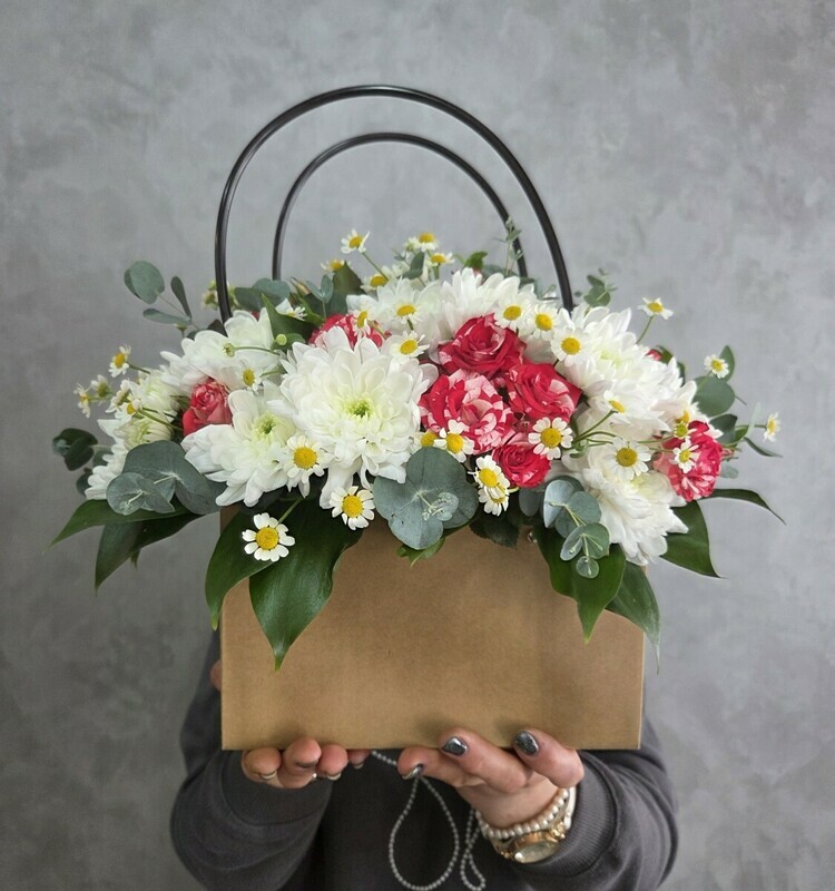 Hrizantema kustovaya Baltika 3sht, roza kustovaya Faer Foks 3sht, kustovaya romashka 2sht, ruskus 5sht, evkalipt 0.5sht, sumka bol_shaya, piaflor 1sht