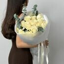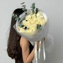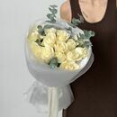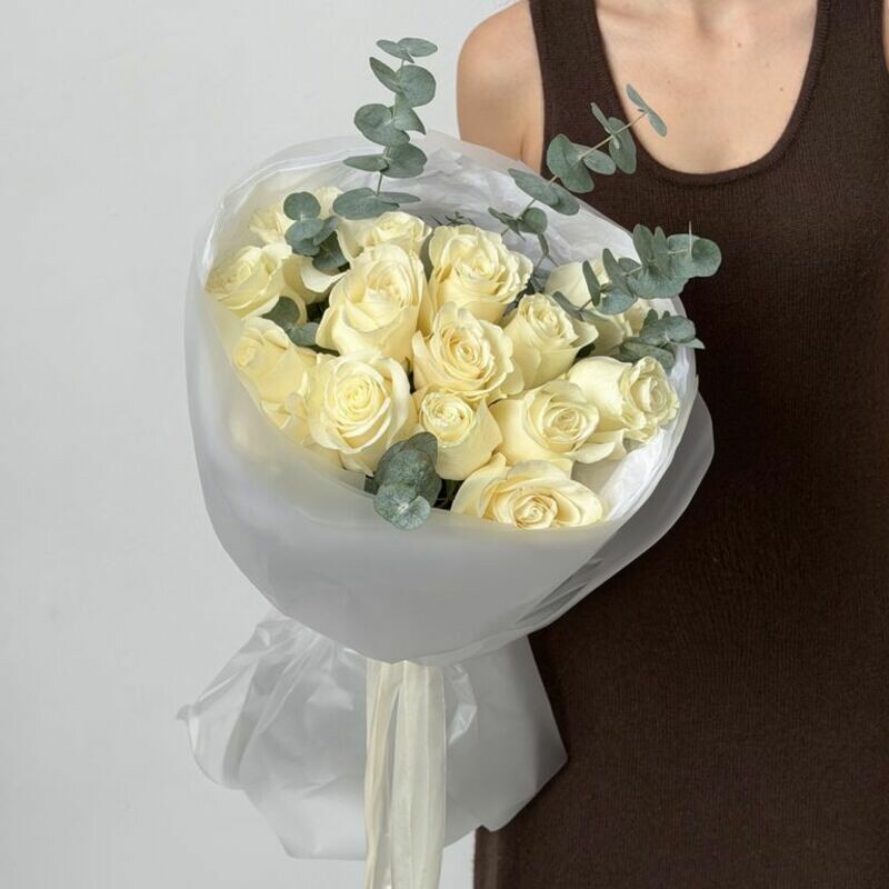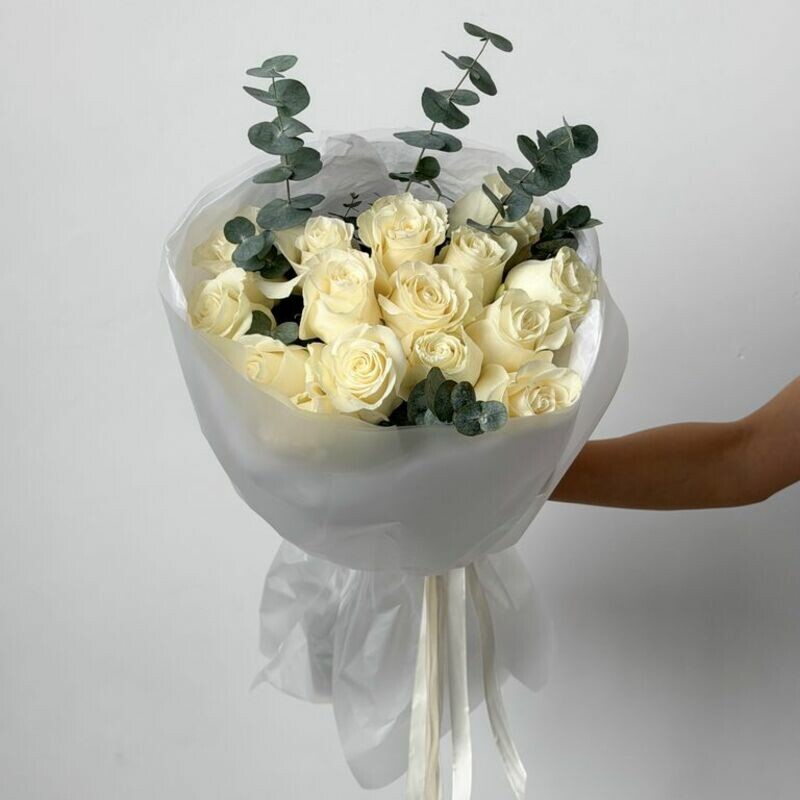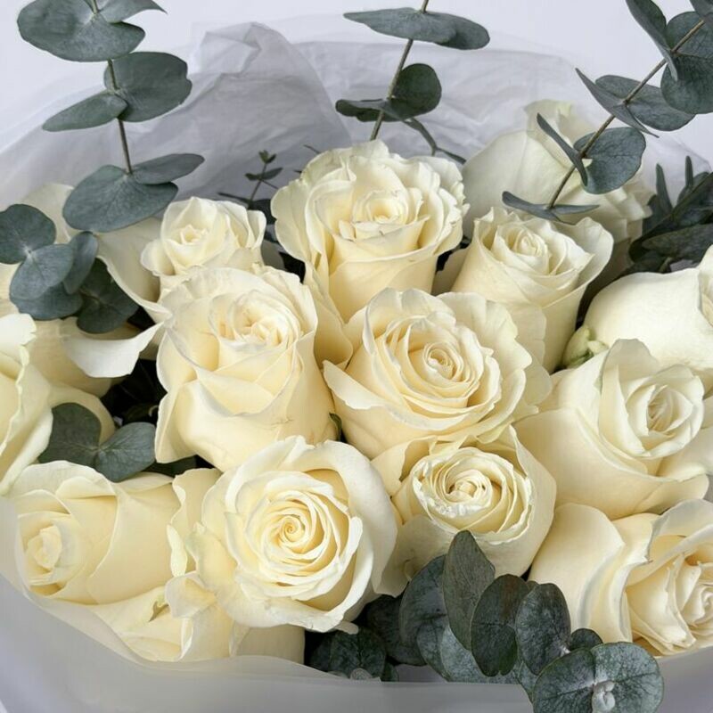 Buket iz 15 belih roz Mondial s evkaliptom, standart