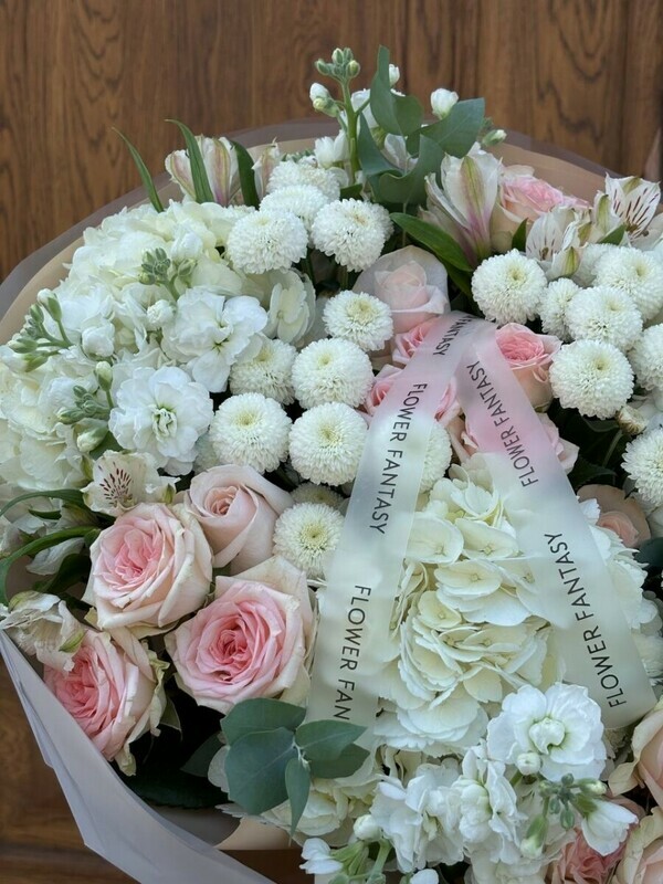 Buket s gortenziej, kustovoj rozoj, hrizantemoj i mattioloj