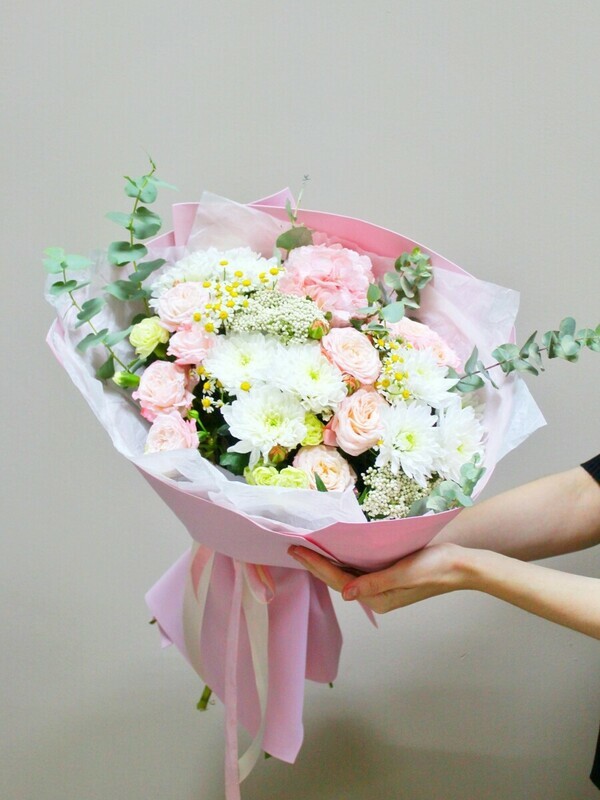 Nezhnij buket iz kustovih roz pastel_nih ottenkov s aktcentami iz belih hrizantem, romashek, dopolnennij sochnimi vetochkami evkalipta.Buket prekrasno vpishetsya v lyuboj povod: ot dnya rozhdeniya i yubileya do prostogo zhelaniya napomnit_ dorogomu cheloveku, kollege ili podruge o svoih tyoplih chuvstvah. Po zaprosu dobavim vozdushnie shari, sladosti, myagkie igrushki.