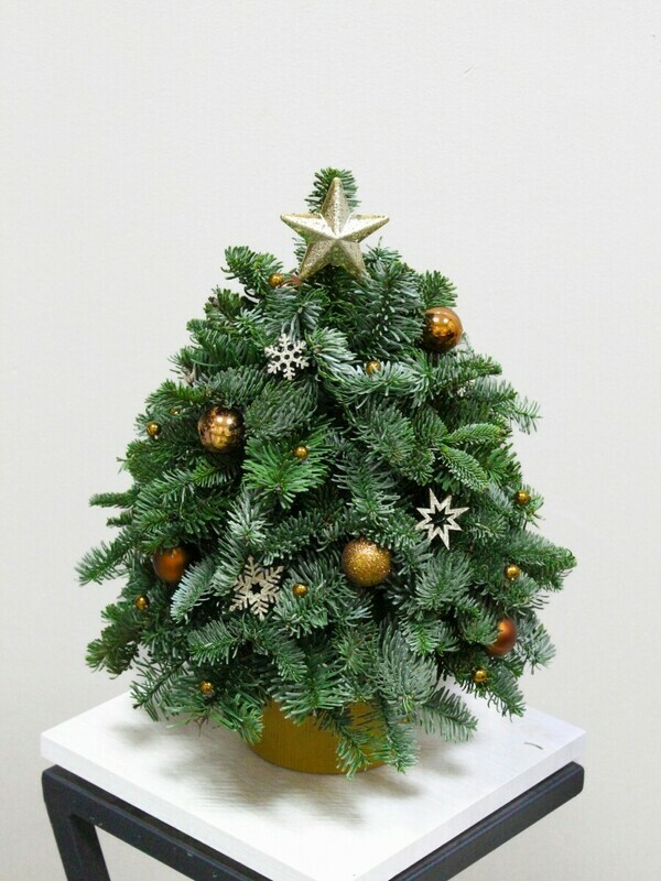 Mini-yolochka s zolotimi sharami, snezhinkami i siyayushej zvezdoj na makushke. Pishnie vetvi v stil_noj zolotistoj podstavke — ideal_nij prazdnichnij aktcent! Etot buket prekrasno dopolnit podarok na zimnij den_ rozhdeniya, Novij god, Rozhdestvo i drugie povodi v zimnie mesyatci. Po zaprosu dobavim v zakaz sladosti, igrushki, vozdushnie shari ili vazu.
