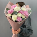 11 belo-rozovih diantusov s evkaliptom