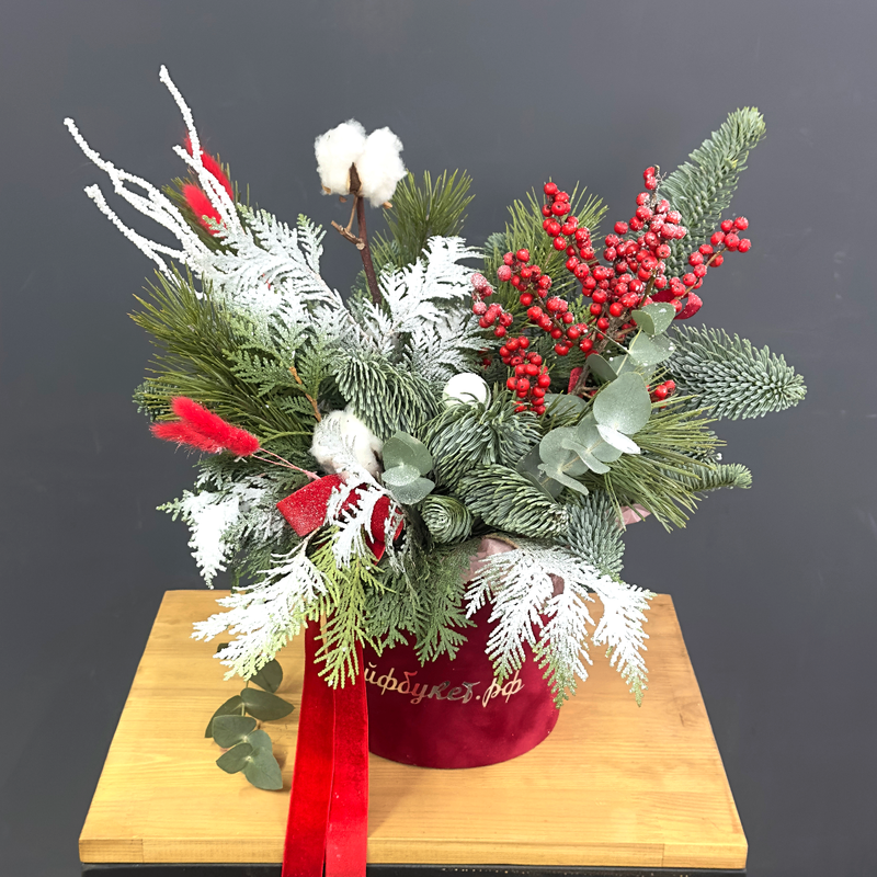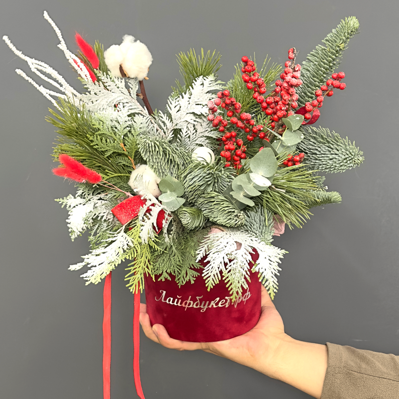 Podarite atmosferu zimnej skazki s etoj prazdnichnoj kompozitciej! v nej sochetayutsya svezhie hvojnie vetki, ukrashennie iskusstvennim snegom, yarkie krasnie yagodi ileksa i nezhnie hlopkovie sotcvetiya. Elegantnij krasnij barhatnij korob krasiv i funktcionalen — on dobavlyaet iziskannosti i nadezhno uderzhivaet kompozitciyu. Ideal_nij podarok dlya sozdaniya tyoplogo uyuta i prazdnichnogo nastroeniya v dome, ofise ili na lyubom torzhestvennom meropriyatii. Eta kompozitciya ne tol_ko ukrasit inter_er, no i napolnit prostranstvo svezhim aromatom hvoi i novogodnego volshebstva. Preimushestva: - natural_nie i iskusstvennie materiali v garmonii - dolgovechnost_ i stojkost_ k peremenam temperaturi - ideal_no podhodit dlya doma i ofisa - privlekaet vnimanie i sozdaet prazdnichnoe nastroenie viberite «simfoniya rozhdestva» — sdelajte zimu yarche i teplee!
