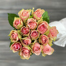 Buket iz 13 zeleno-rozovih roz s lentoj Keniya 40 sm.