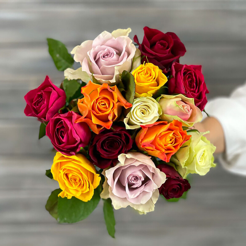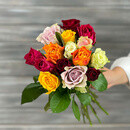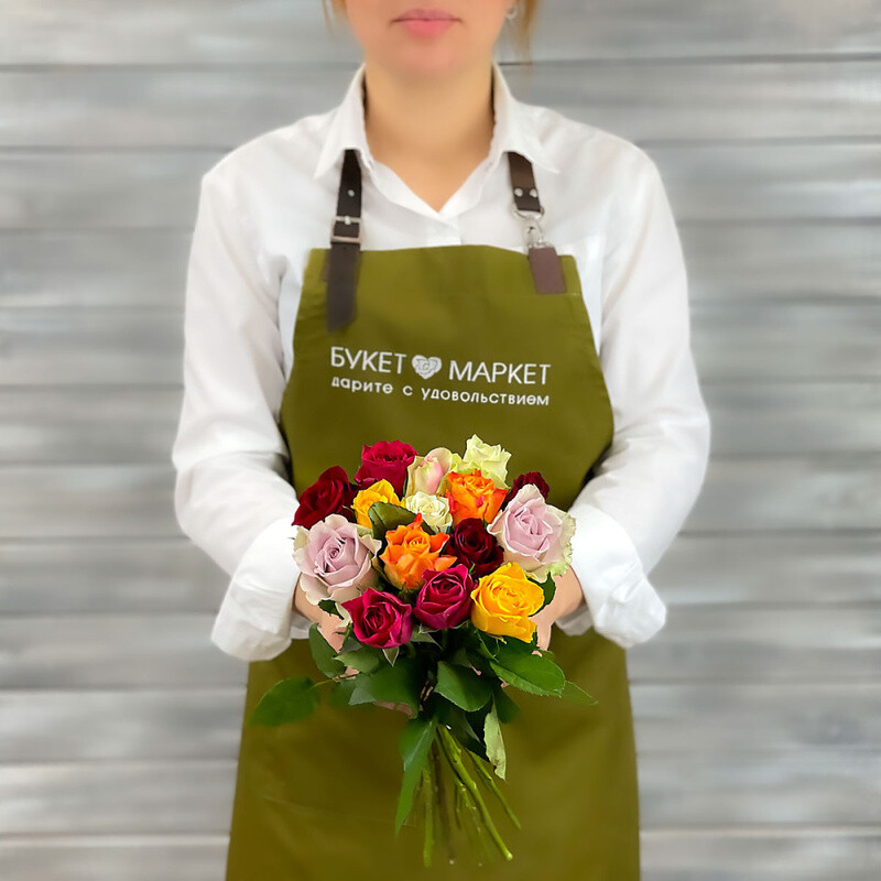 Buket iz 13 raznotcvetnih roz s lentoj Keniya 40 sm.