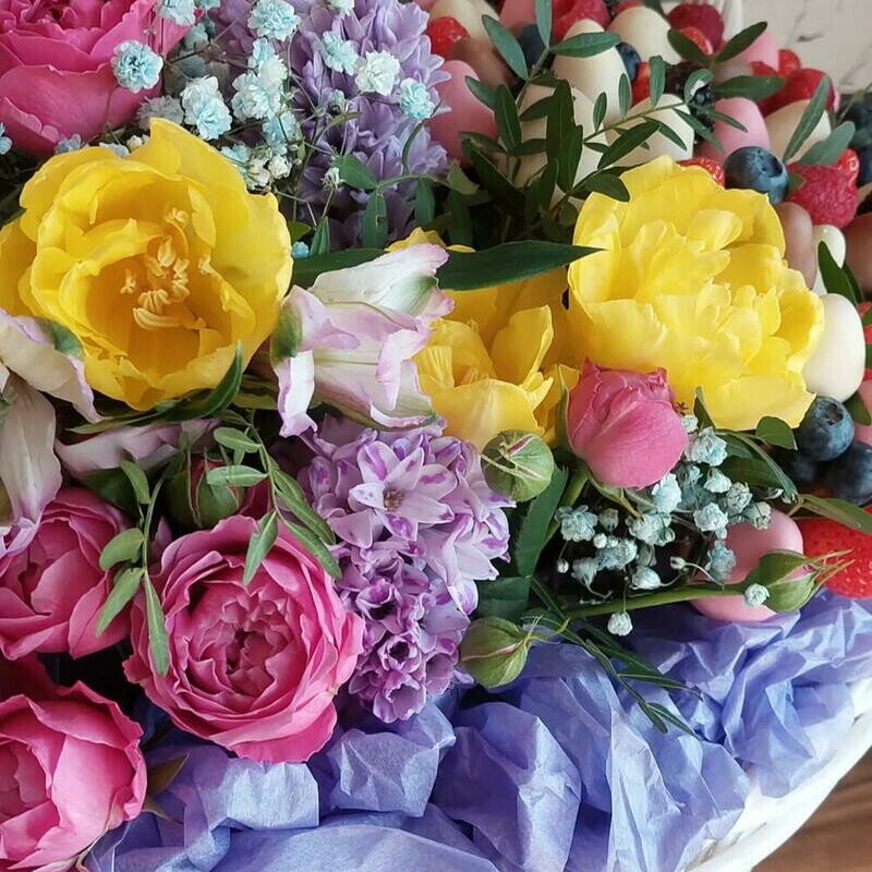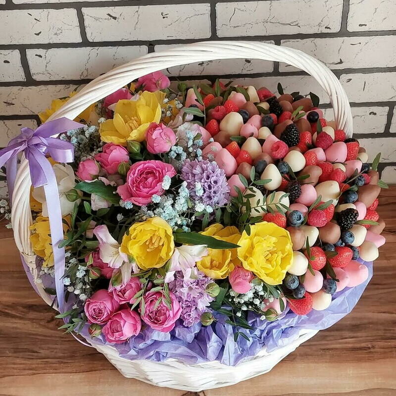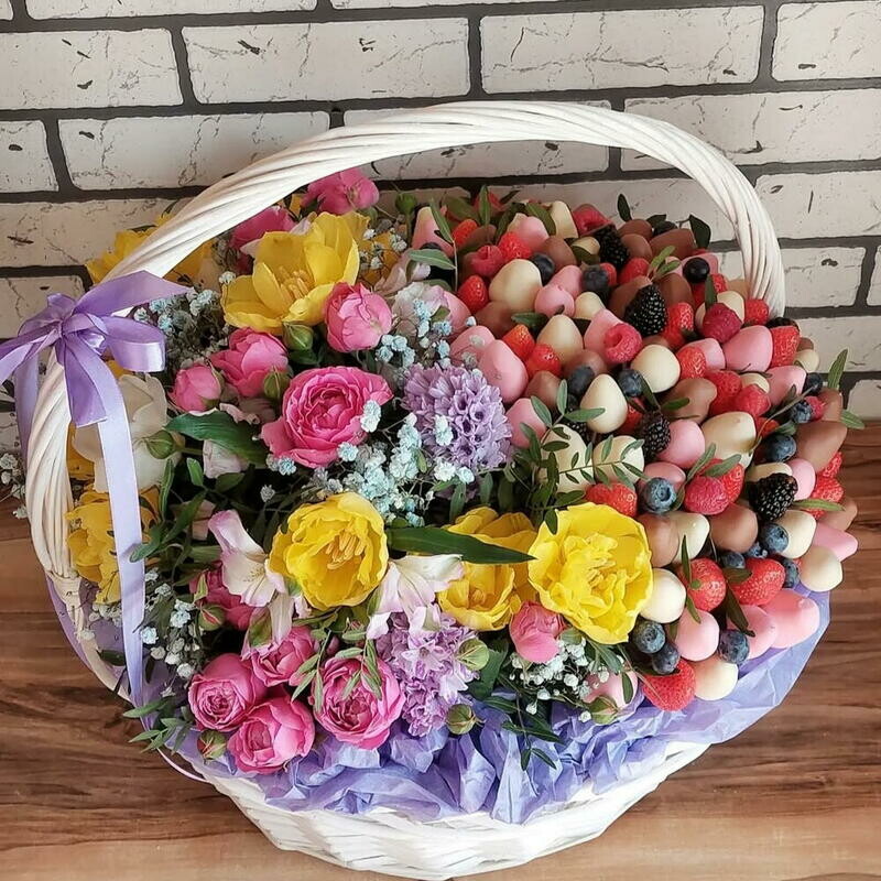 Avtorskaya premial_naya korzina s klubnikoj v shokolade i tcvetami, premium