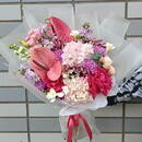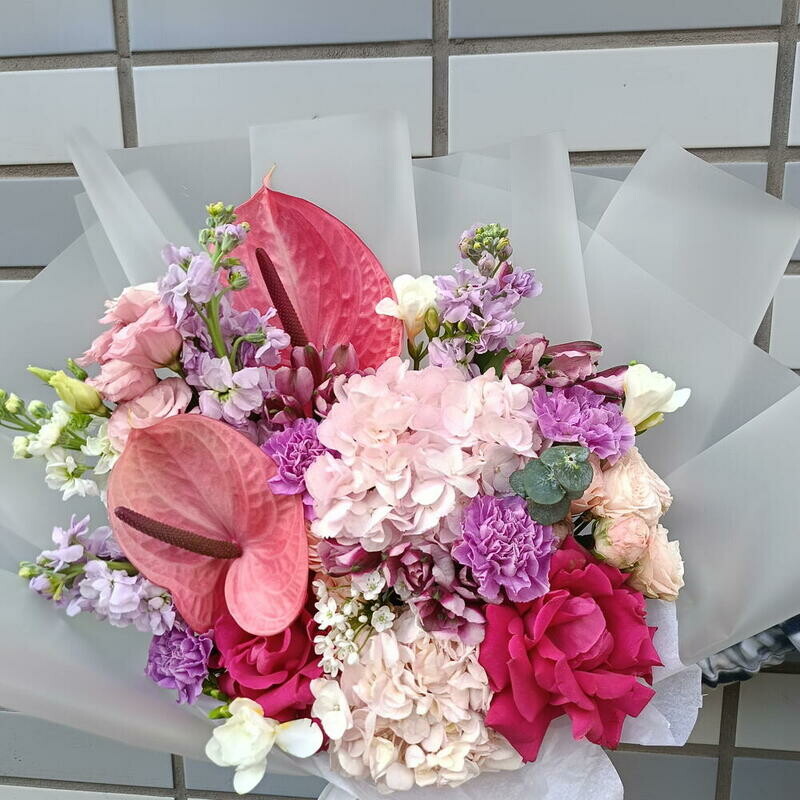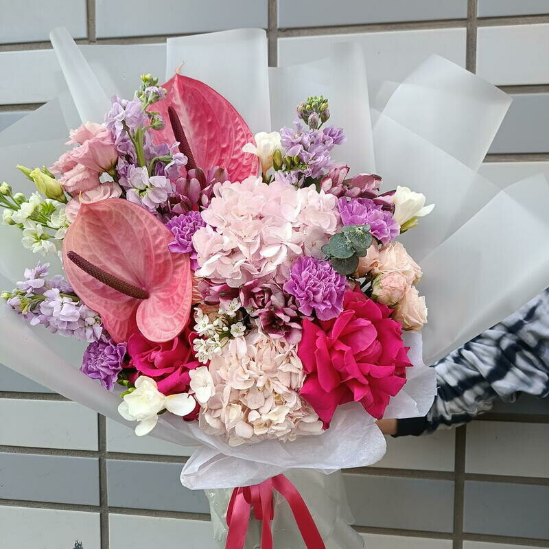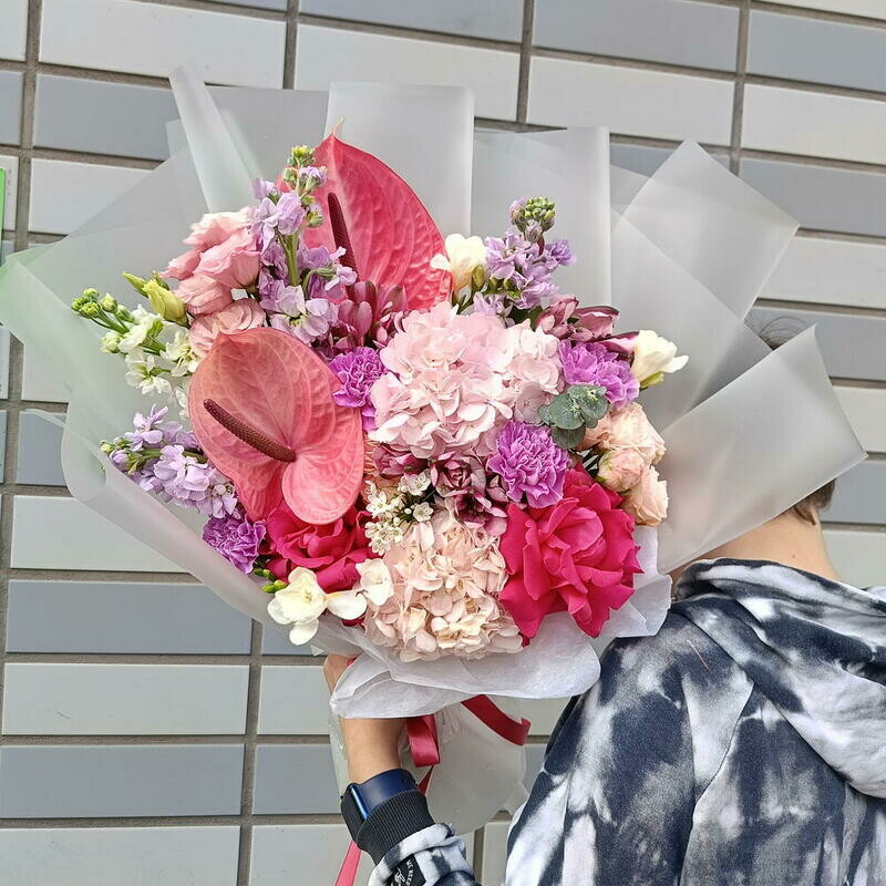 Avtorskij buket s anturiumom i gortenziej Gortenziya Anturium Frantcuzskaya roza Evkalipt, premium