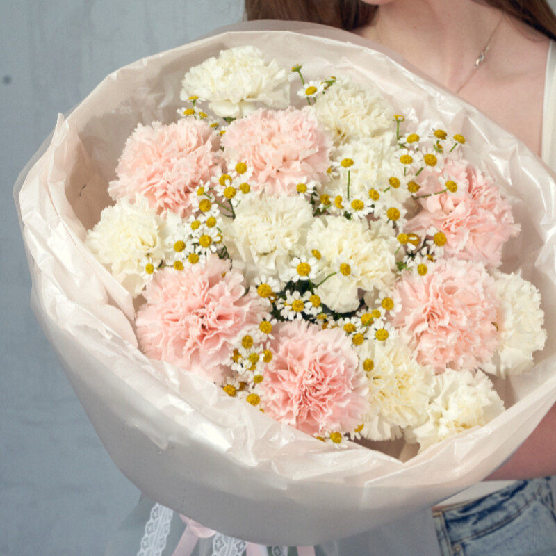 Nezhnij buket iz diantusa i kustovoj romashki — garmoniya myagkih ottenkov i estestvennoj krasoti. Diantus pridayot utonchyonnost_, a kustovaya romashka dobavlyaet lyogkosti i iskrennego ocharovaniya.
