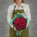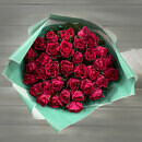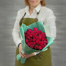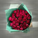 Buket iz 21 malinovoj rozi v upakovke Keniya 40 sm.