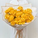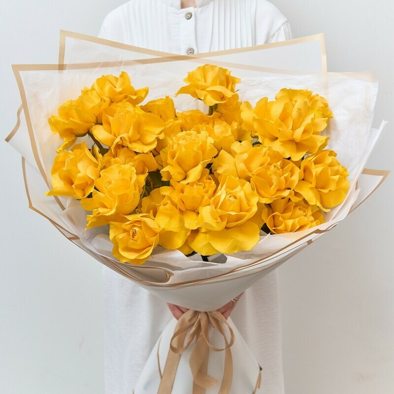 Izyashnij buket iz 27 zhyoltih roz — eto voploshenie solnechnogo nastroeniya i iskrennih pozitivnih emotcij. Ne slishkom pishnij, no virazitel_nij, on ideal_no balansiruet mezhdu skromnim znakom vnimaniya i torzhestvennim podarkom.