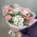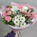 Букет из хризантем, кустовых роз и эвкалипта в нежной упаковке
