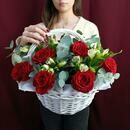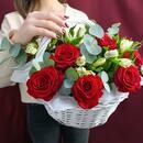 Роскошная яркая корзина из роз, альстромерий и эвкалипта