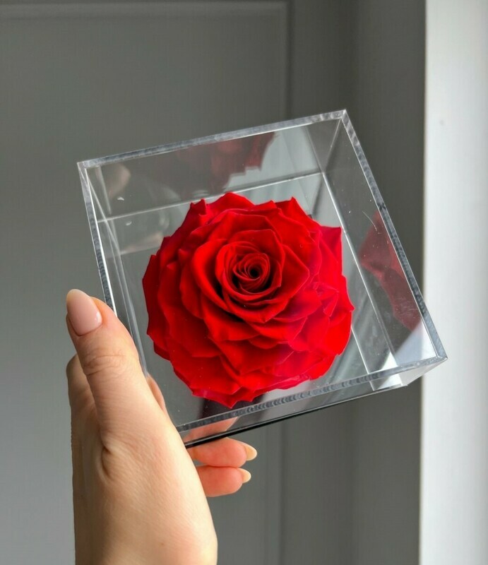 Вечная роза в акриловой коробке - это консервированная красная роза, изящно представленная в прозрачной акриловой коробке, украшенной нежным бантиком. Такие цветы хранятся от 3 лет. Красная роза - символ страсти и сильных чувств. Ее яркий оттенок красного словно вызывает всплеск эмоций и радости. Прозрачная акриловая коробка - это своего рода витрина, где красавица-роза предстает перед вами во всей своей красе. Вы можете любоваться ею, не нарушая ее нежности и свежести, как будто она только что была сорвана с лучшего садового куста. Эта композиция - это не просто роза, это проявление вашего тонкого вкуса и стиля. Она станет уникальным акцентом в вашем интерьере, привлекая восхищенные взгляды и создавая атмосферу элегантности и красоты. Подарите ее себе или своим близким и позвольте этой прекрасной красной розе рассказать свою уникальную историю о страсти и красоте.