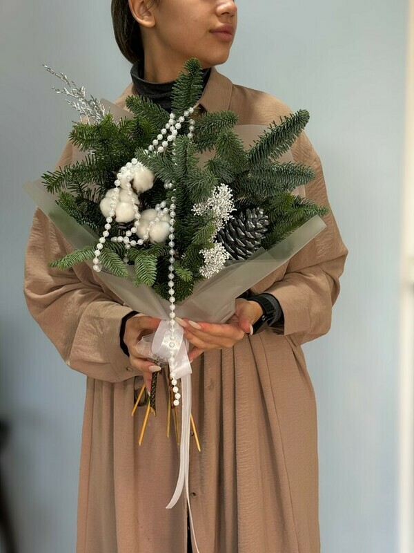 Окутайте свой дом атмосферой волшебства с изысканным новогодним букетом из благородной пихты, нежного хлопка и праздничных украшений. Эта композиция — не просто декор, а настоящее воплощение зимнего чуда, способное подарить тепло и радость вашим близким.