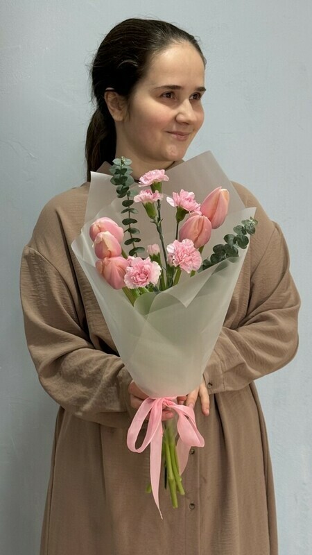 - Букет из тюльпанов, гвоздики кустовой и эвкалипта 126