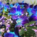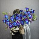 Этот букет — словно фрагмент звёздного неба, воплощённый в цветах. Сине-фиолетовые орхидеи напоминают далёкие галактики, мерцающие в космической тишине. Нежные соцветия гипсофилы — как звёздная пыль, рассыпанная по Вселенной. Зелёная листва добавляет композиции живости, а серебристая лента — элегантности. Этот букет будто приглашает окунуться в магию космоса и забыть о земных заботах.