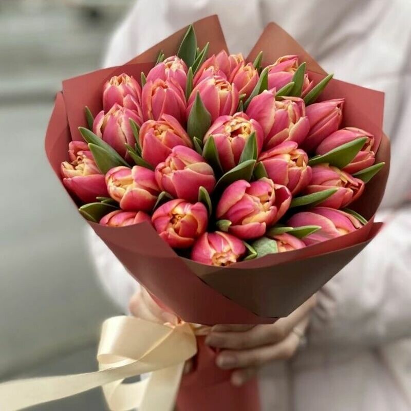 - 25 розовых пионовидных тюльпанов с оформлением