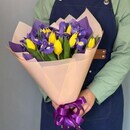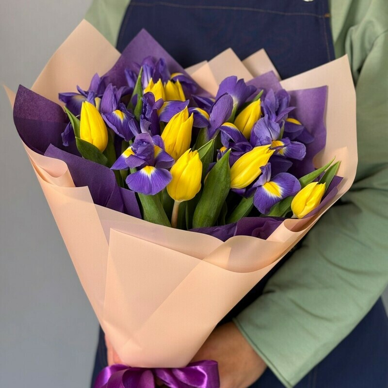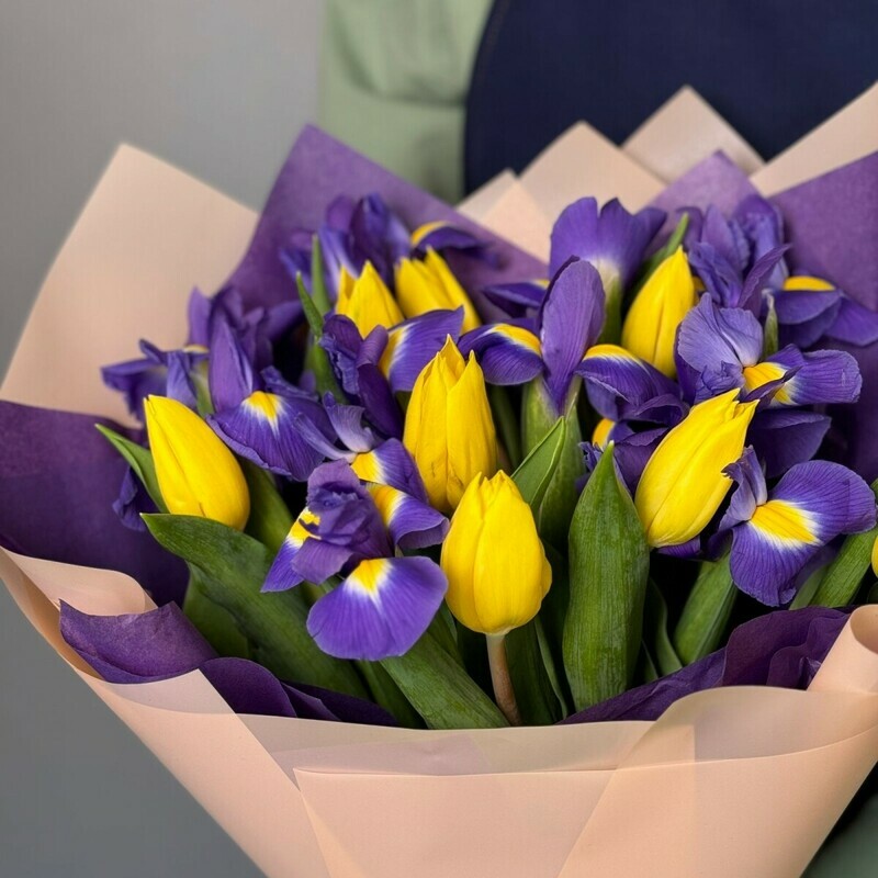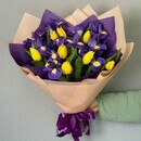 - Яркий букет с ирисами и тюльпанами