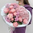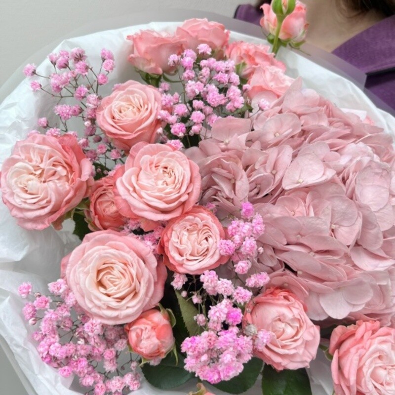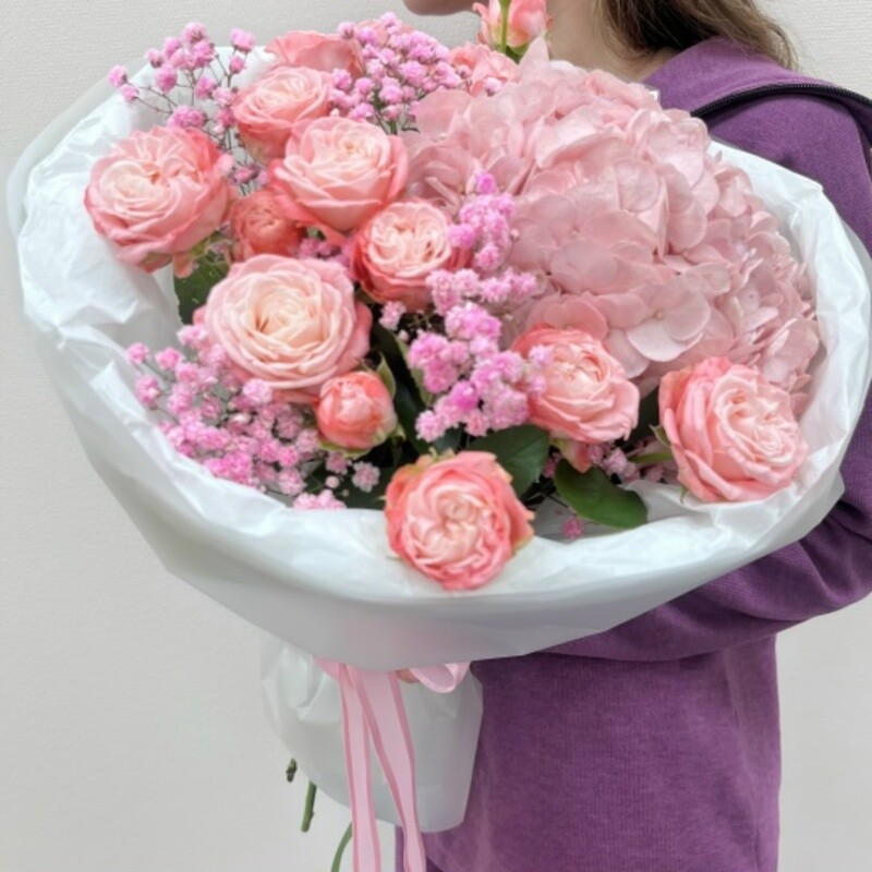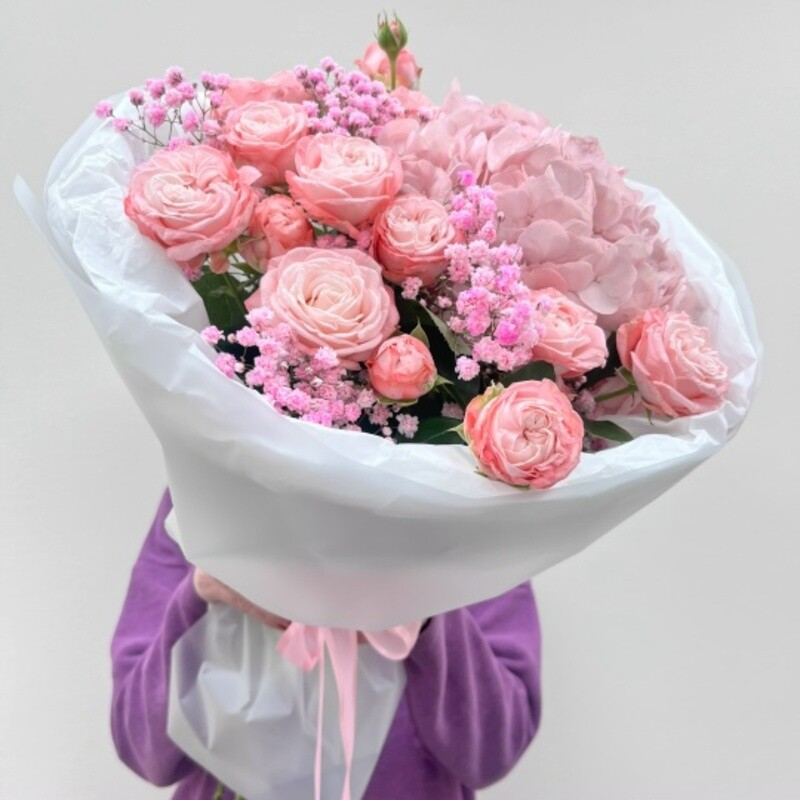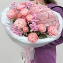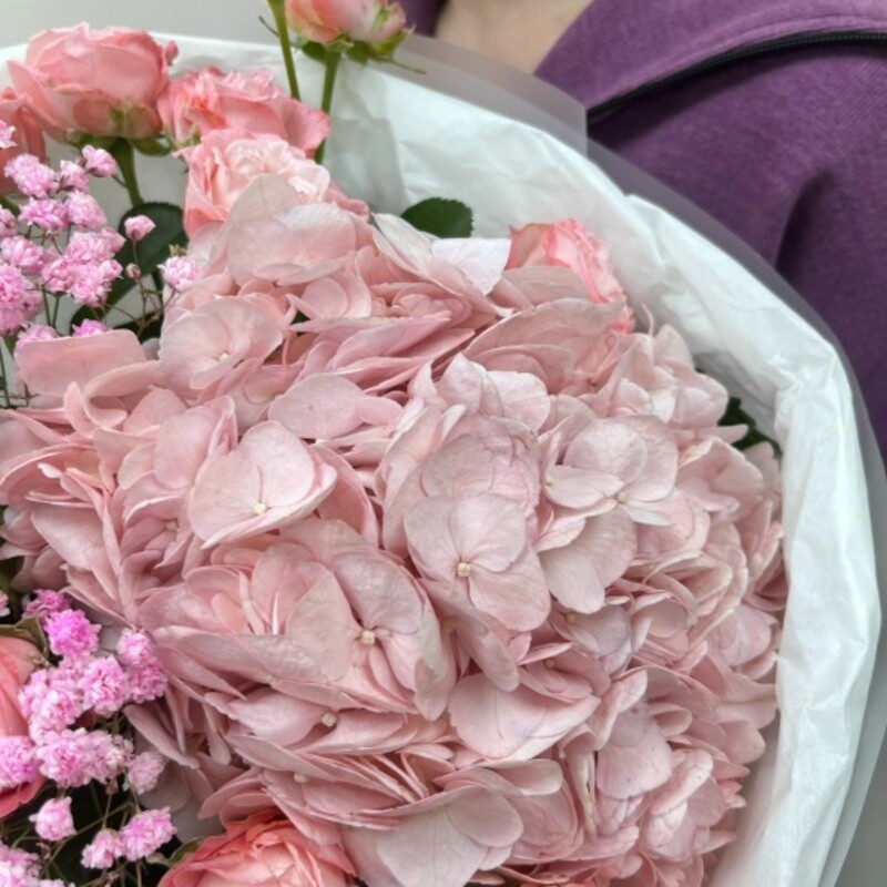 - Букет с гортензией и кустовыми розами