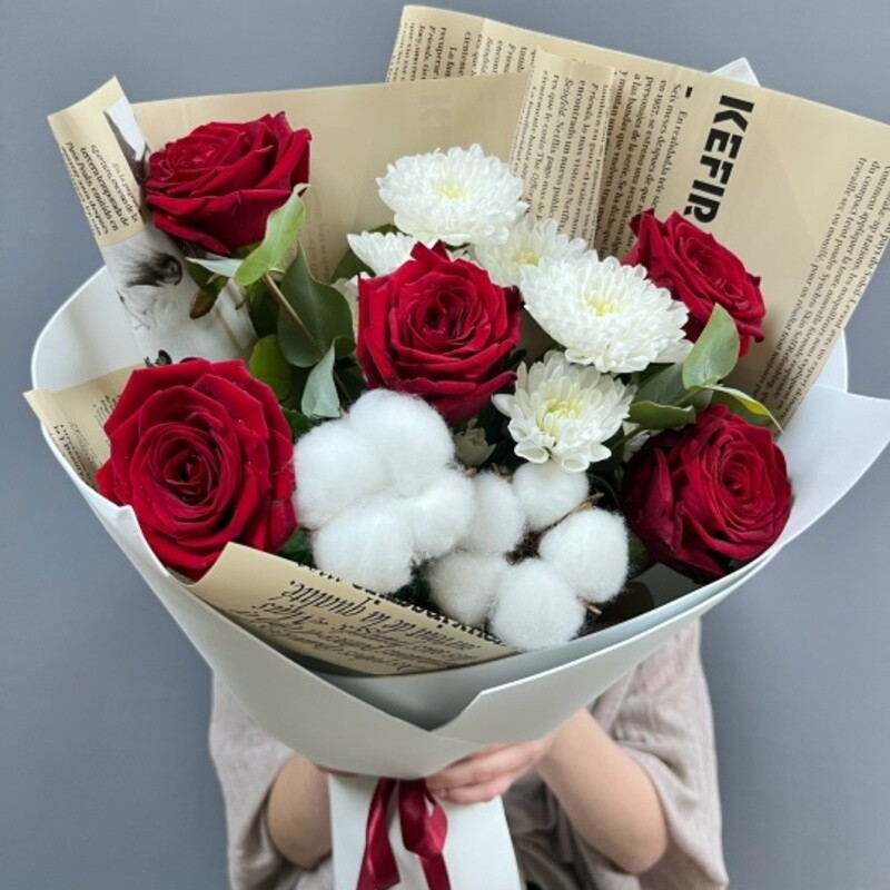 Букет с красными розами и хризантемой