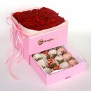 - Шкатулка с клубникой в шоколаде и 16 розами