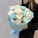 - Букет из хризантемы, голубых гвоздик (диантусов) и хлопка